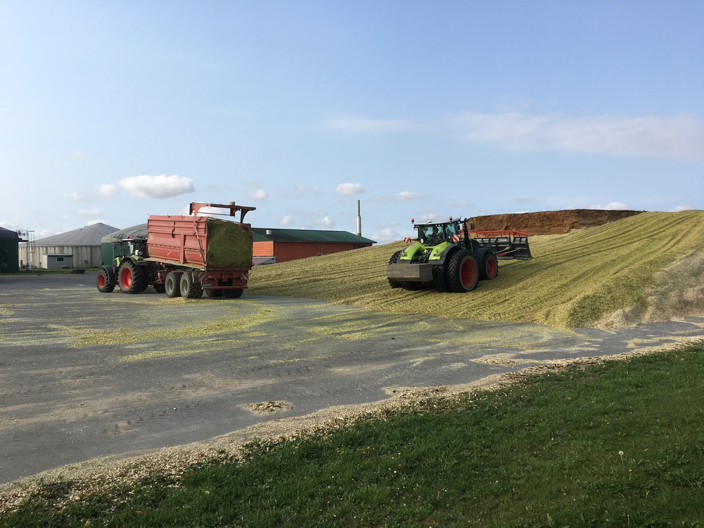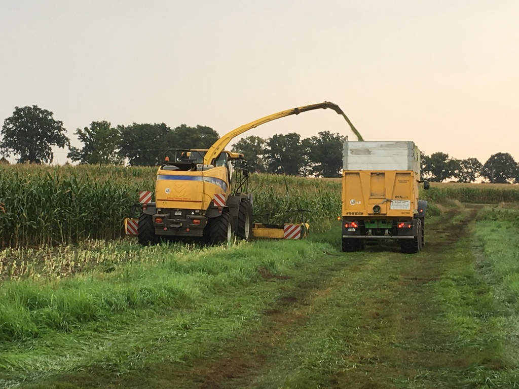 Oder besser nicht - Wir sind bereits seit 10 Tagen in der Maisernte und haben bisher sämtliche außen liegenden Schläge beerntet. Dies machen wir immer so, damit der doch recht große Haufen nicht so groß dimensioniert lange unabgedeckt offen liegt. Die Schlagkraft ist doch bei Entfernungen bis zu 15 km deutlich geringer, so dass wir an diesen ersten Tagen nur täglich um die 800 to einfahren können. Als wir dann vorgestern den ersten hofnahen Schlag beginnen konnten, haben wir zum Vergleich an einem Tag von morgens um 07:00 Uhr bis abends um 19:00 Uhr 1430 Tonnen Silomais geerntet - dies ist gut funktionierenden Maschinen und vor allen Dingen sehr guten Mitarbeitern zu verdanken, die wie ein Uhrwerk funktionieren und genau wissen, worauf es bei der Maisernte ankommt.