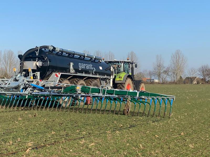 Im letzten Sommer und Herbst, haben wir für diese Aufgabe einen Lohnunternehmer beauftragt. Wir fanden jedoch niemanden, der mit einem Schleppschuhgestänge auf 18 m Arbeitsbreite in die Getreidebestände fahren wollte. Somit haben wir uns im Januar entschieden, einen gebrauchten Güllewagen mit einem 18m Schleppschlauchverteiler zu kaufen, und das Gestänge kurzerhand auf unseren inzwischen fast 20 Jahre alten Güllewagen zu montieren. Des Weiteren wurde das Gestänge mit Schleppschuhen ausgerüstet, so dass wir nun für unsere emissionsarme Ausbringung der Richtlinie entsprechend selber technisch ausgerüstet sind.