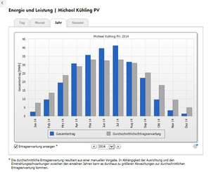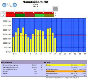 Unten sehen Sie zwei Auswertung der beiden Anlagen. Zunächst sehen Sie die Jahresauswertung für 2014 für die eingespeisten Kilowattstunden für die einzelnen Monate, danach sehen Sie den aktuellen Monat April 2015 für die Anlage in Völschow.